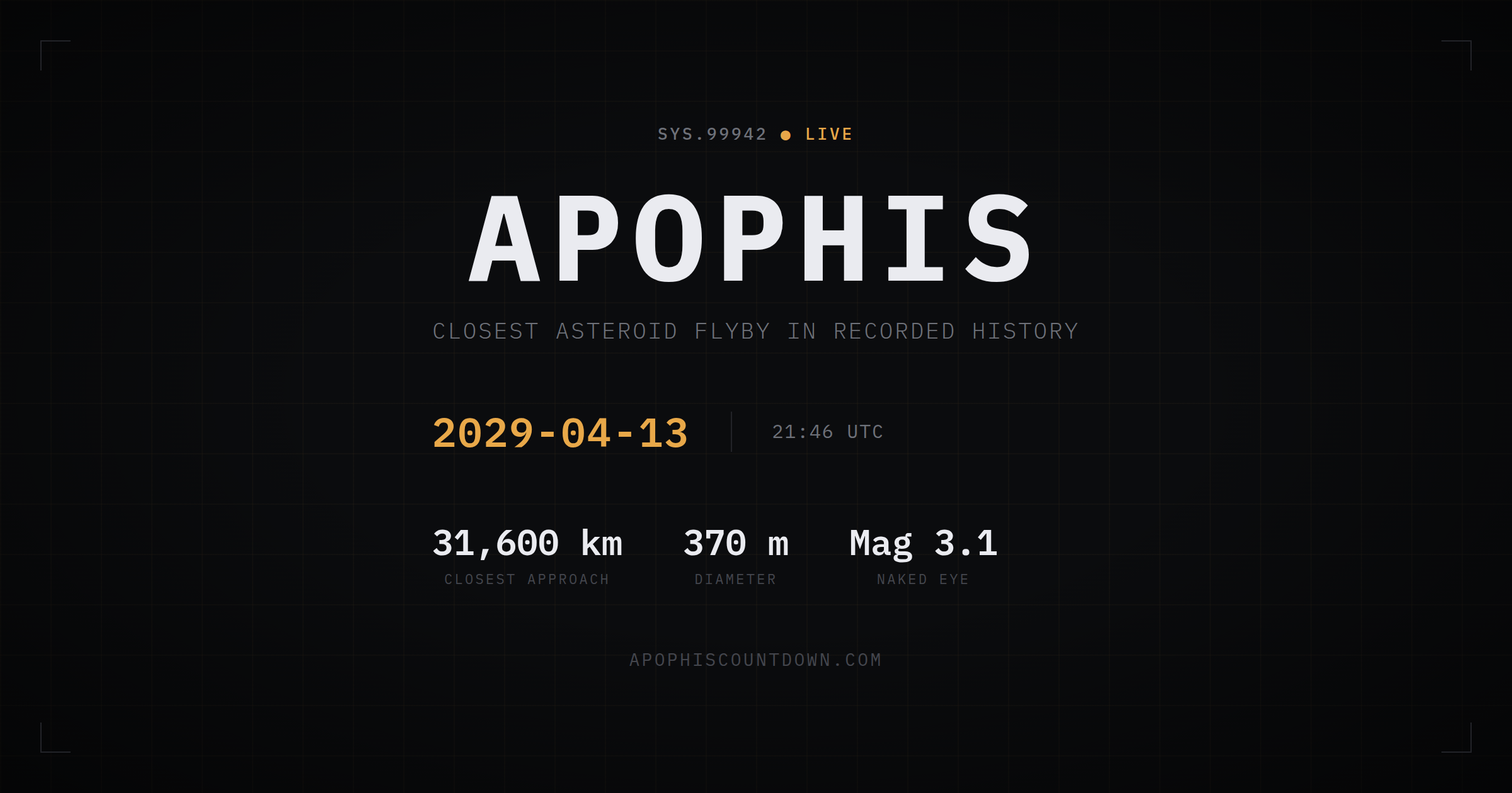 GET /api/arrival → countdown + timestamp GET /api/position → heliocentric + geocentric GET /api/facts → structured Apophis data GET /api/orbit → elements + path arrays Rate limit: 60 req/min. No key required.